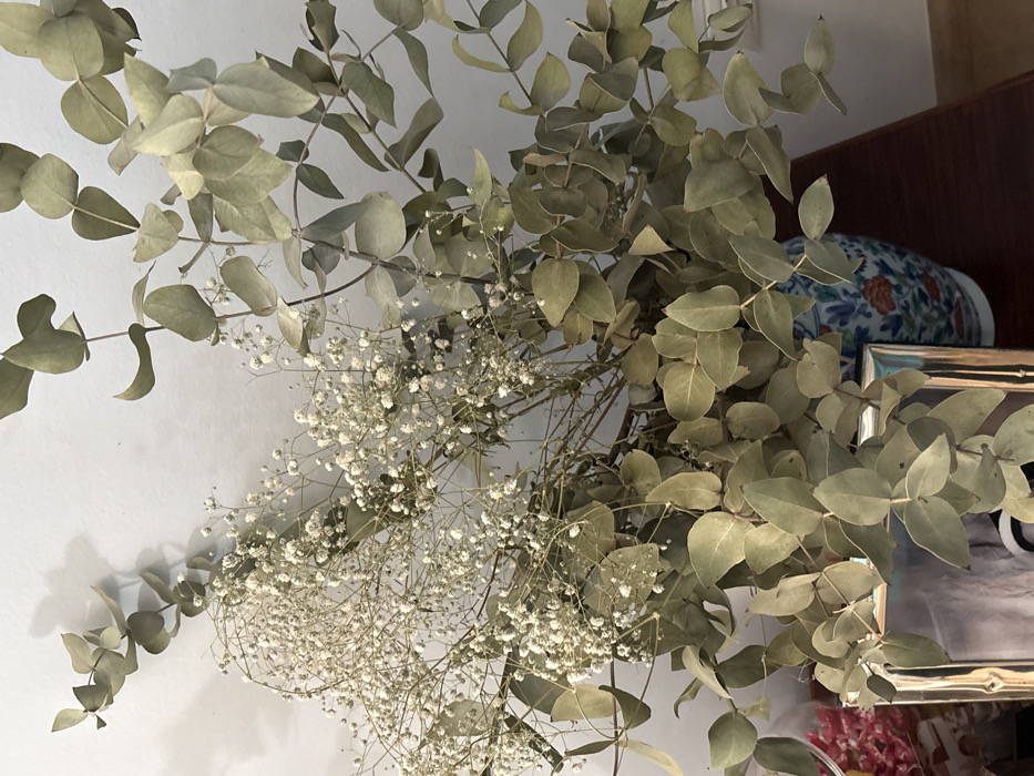 This image displays an indoor scene located in Urbanización Encinares De Alcolea, Spain. The primary subject is a large bouquet of dried plant material, consisting predominantly of pale green eucalyptus leaves and white Gypsophila (baby's breath) flowers. This arrangement is contained within a ceramic vase, which is white and blue with a distinct floral pattern, featuring red accents. The vase rests on a dark, polished wooden surface. In the lower-left foreground, a silver-toned picture frame is partially visible, obscuring a portion of the eucalyptus branches. The background consists of a plain, light-colored wall, upon which shadows from the botanical arrangement are cast. No individuals are present in the image.