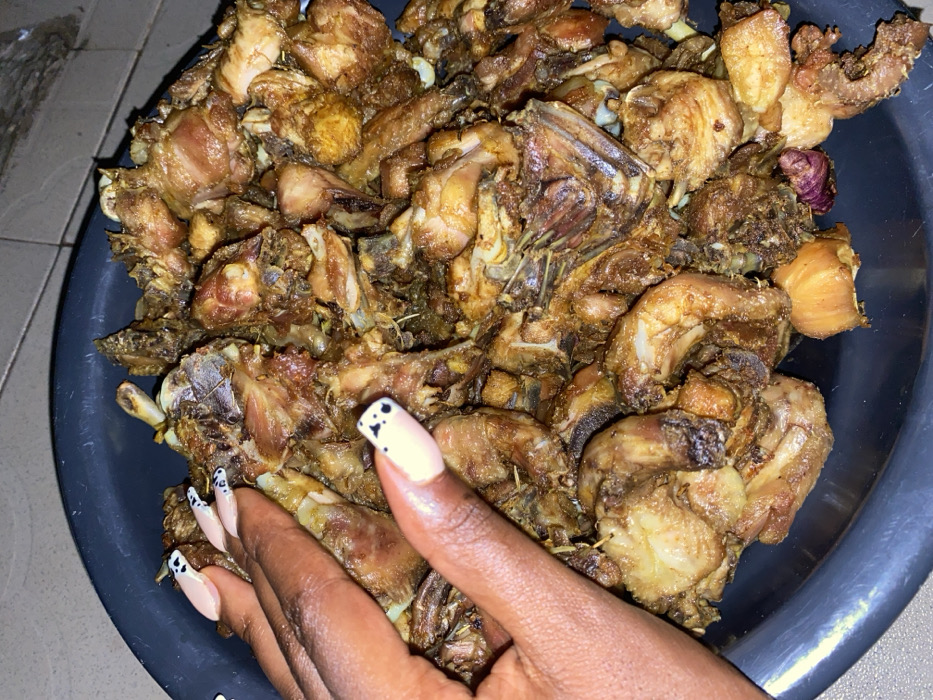 A top-down shot shows a large bowl filled with cooked chicken pieces. The chicken appears golden brown and crispy, with visible bones and some herbs mixed in. A dark-skinned hand with painted nails rests on the chicken, partially obscuring some pieces. The bowl is a dark, likely black or gray, color. The background is a blur, possibly a tiled surface.