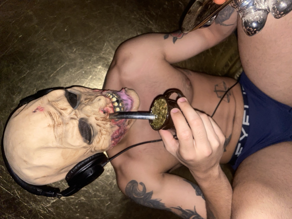 A man wearing a zombie mask and headphones is lying down. The mask is grotesque with exposed teeth and bloody details. He is shirtless and has tattoos on his arms and chest, as well as blue briefs. He holds a small cup with a metal straw in his hand, appearing to drink from it. There is a decorative metallic object in the upper right corner of the frame. The background surface has a reflective, metallic sheen.