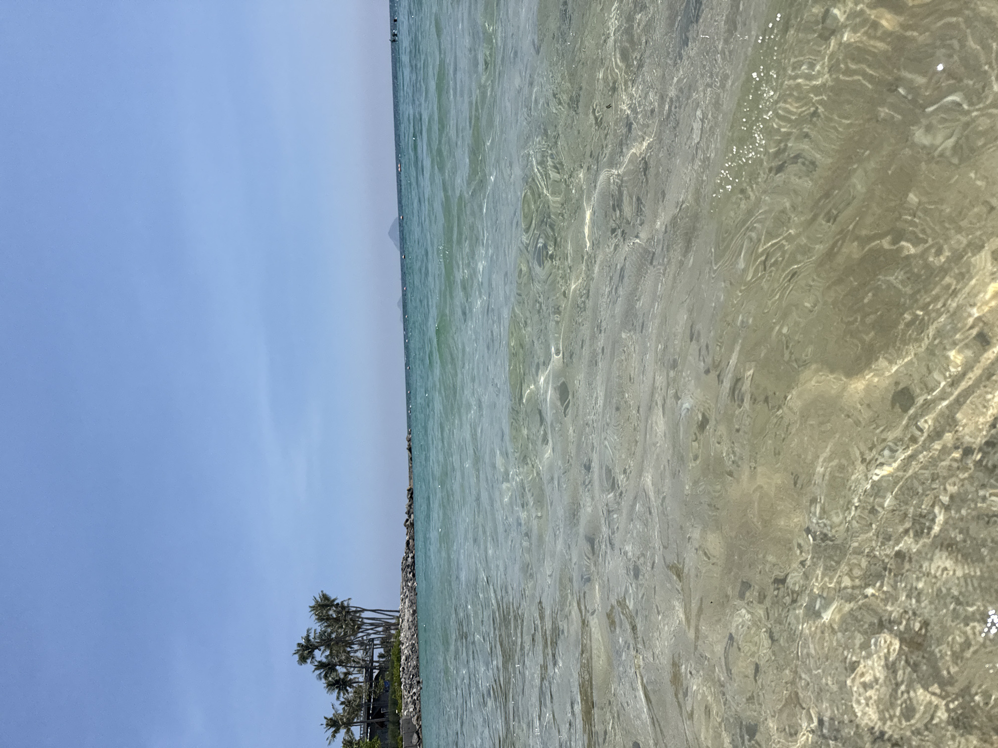The image displays a coastal scene in Nha Trang, Vietnam, captured from a low vantage point within the shallow ocean water. The foreground reveals clear, light-colored water with visible sandy and pebbled seafloor, characterized by surface ripples and scattered sunlight reflections. To the left, a rocky breakwater or natural rock formation extends from the shoreline, behind which a cluster of palm trees is visible, partially obscuring a multi-tiered coastal structure. The midground features the open ocean, with water transitioning from clear turquoise closer to shore to a deeper blue-green further out. Several orange buoys are distributed across the water's surface, and multiple indistinct human figures are observed swimming or wading in the distant water. The background consists of a clear, light blue sky, beneath which the faint silhouettes of distant islands or hills are present on the horizon, including a notable conical peak towards the right.