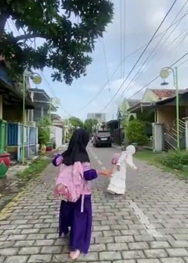 Two girls, dressed in modest clothing, stand on a cobblestone street in a residential neighborhood. The older girl wears a purple dress with a pink and purple jacket and a black hijab. She carries a pink backpack. The younger girl is dressed in a white outfit with a white hijab. They are positioned in the center of the street, with houses visible on both sides. Overhead, power lines crisscross the sky. A dark-colored car is parked further down the street. The sky is overcast, and a large tree with dense foliage is visible on the left side of the frame.