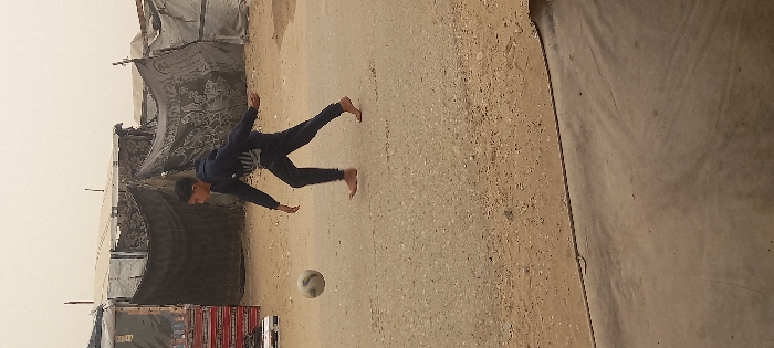 A person in dark clothing kicks a soccer ball in a dirt area near makeshift shelters. The person appears to be barefoot and is mid-kick, with legs outstretched. The shelters appear to be constructed from various materials, possibly tarps or canvas. A truck or vehicle with a red container is seen near one of the shelters. The background suggests a dry or arid environment with a hazy sky.