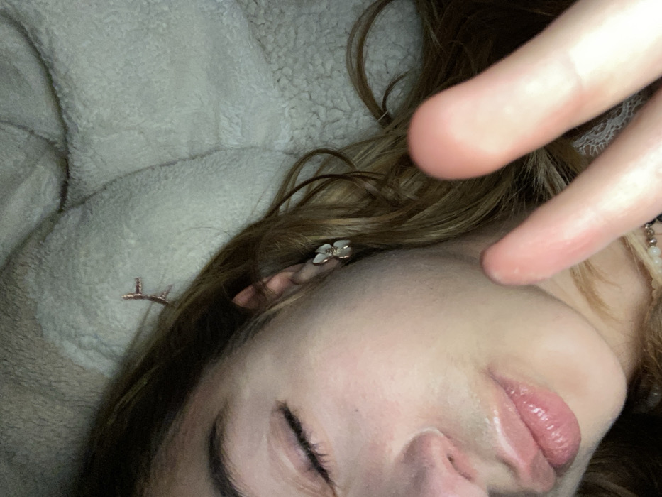 A close-up captures a woman's face at an oblique angle. Her eyes are closed, and her mouth is slightly open, revealing glossy lips. A hand with blurred fingers partially covers the view. Brown hair frames her face, adorned with small decorative clips, one shaped like a flower. A fuzzy, cream-colored fabric provides a soft background.