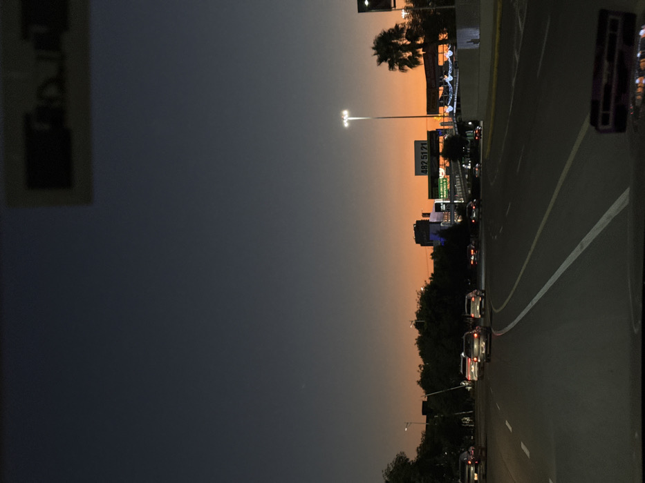 An urban landscape at dusk shows a multi-lane road filled with cars moving away from the viewer. Buildings and trees line the road against an orange and darkening sky. Street lights illuminate the scene, while billboards and signs are visible in the distance. A palm tree silhouette can be seen at the top of the frame. Some blurry objects are visible in the foreground.