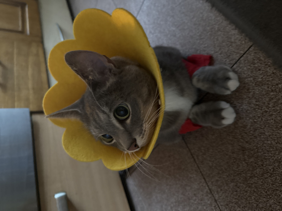 A domestic tabby cat, predominantly grey-brown with a white chest and front paws, sits on a tiled floor indoors in Reutov, Russia. The cat wears a bright yellow, flower-shaped Elizabethan collar and a red garment or harness partially visible on its front torso. Its head is turned to the left, and its eyes are wide open with dilated pupils. In the blurred background, wooden cabinets or furniture are visible, one featuring a silver horizontal handle.