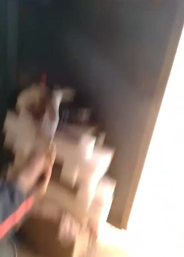 inside of a dark space, possibly a truck or storage container. There is a bag hanging, some items stacked on the floor, and a person's legs are visible at the bottom. The camera moves, and a man in a security guard uniform looks in. The camera then looks out the opening of the space, showing an outdoor area with shipping containers.
