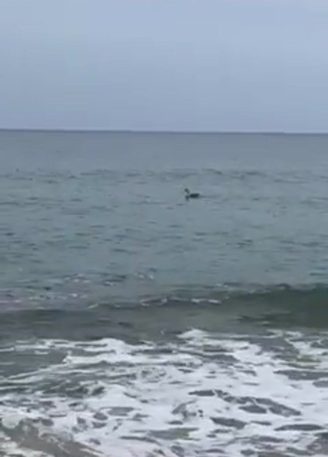 small ocean wave breaking on a sandy beach. A large bird swims in the ocean beyond the wave. The sky is overcast. There are no people visible.