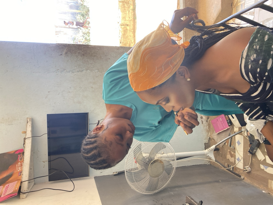 In Sabon Gari Nassarawa, Nigeria, two females are depicted indoors during a makeup application session