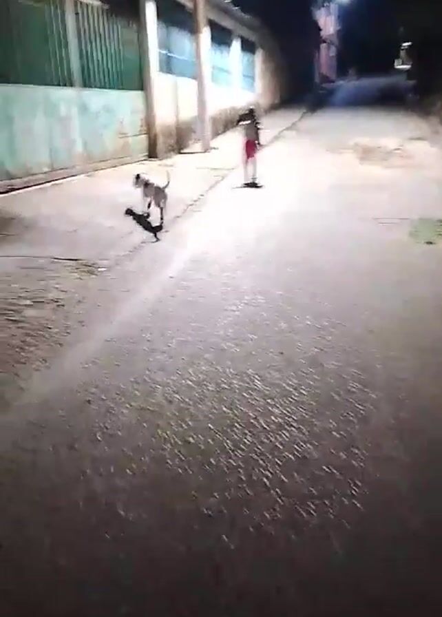 At night, a child wearing red pants and no shirt runs down the center of a narrow, cracked, asphalt road illuminated by streetlights. A small, tan and white dog trots on the left side of the road, behind the child. On the left is a light green building with a metal fence. The other side of the street is obscured by darkness.