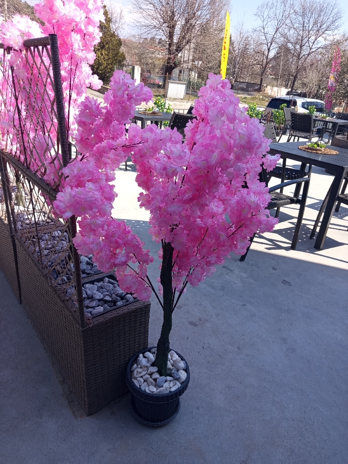 The scene depicts an outdoor patio or seating area, presumably within the city of Goce Delcev, Bulgaria. The foreground and mid-ground feature artificial floral displays. A freestanding artificial tree, resembling a cherry blossom with abundant pink flowers, is centrally positioned. This tree has a dark trunk and branches, green artificial foliage, and stands in a dark-colored, ribbed planter pot. The pot contains a top layer of mixed white and grey decorative stones and rests on a dark saucer directly on the light grey concrete ground. To the left, a linear structure composed of multiple dark brown, wicker-patterned planter boxes or dividers is visible. These boxes are also filled with grey and white stones, and artificial pink blossoms are integrated along their upper edges, creating a continuous display. The light grey concrete ground exhibits minor scuffs and shadows, indicating direct sunlight from the upper right. In the background, beyond the floral arrangements, an outdoor dining or seating area is present, furnished with several dark-colored rectangular tables and matching chairs. Some tables feature small, round, woven placemat-like items. Further into the background, several bare deciduous trees and one evergreen tree are visible under a clear, light blue sky. A light-colored vehicle is partially visible in the far distance, obscured by trees. A tall, narrow yellow banner on a pole is situated in the right mid-background. No individuals are depicted in the image.