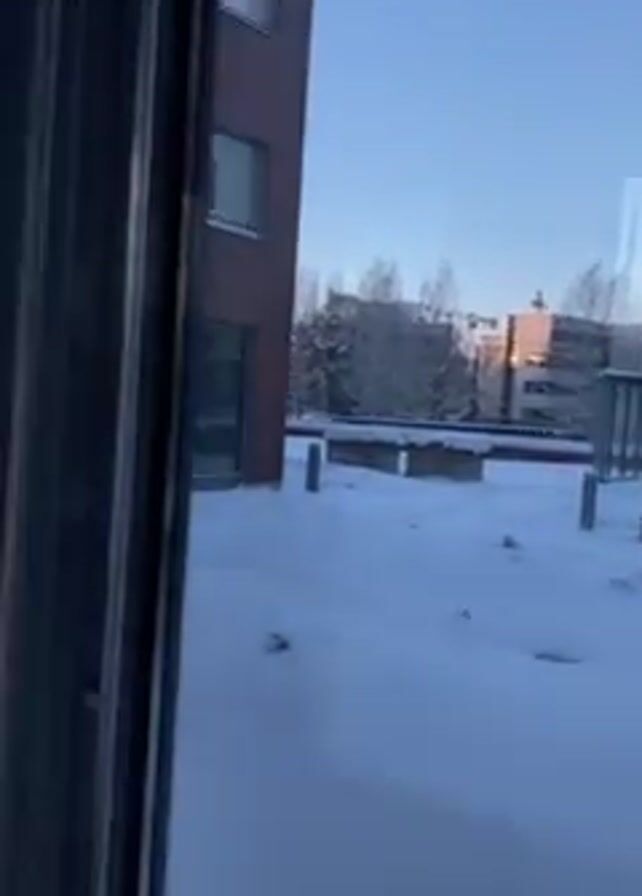 snowy landscape through the glass windows of a building. The scene is predominantly white with snow covering the ground and structures. We see a walkway lined with benches and small structures also covered in snow. Buildings are visible in the background and to the sides, some are brick and others have large windows. A person is seen walking in the snow in the third shot. The sky is clear and blue. The camera moves smoothly, panning across the scene.