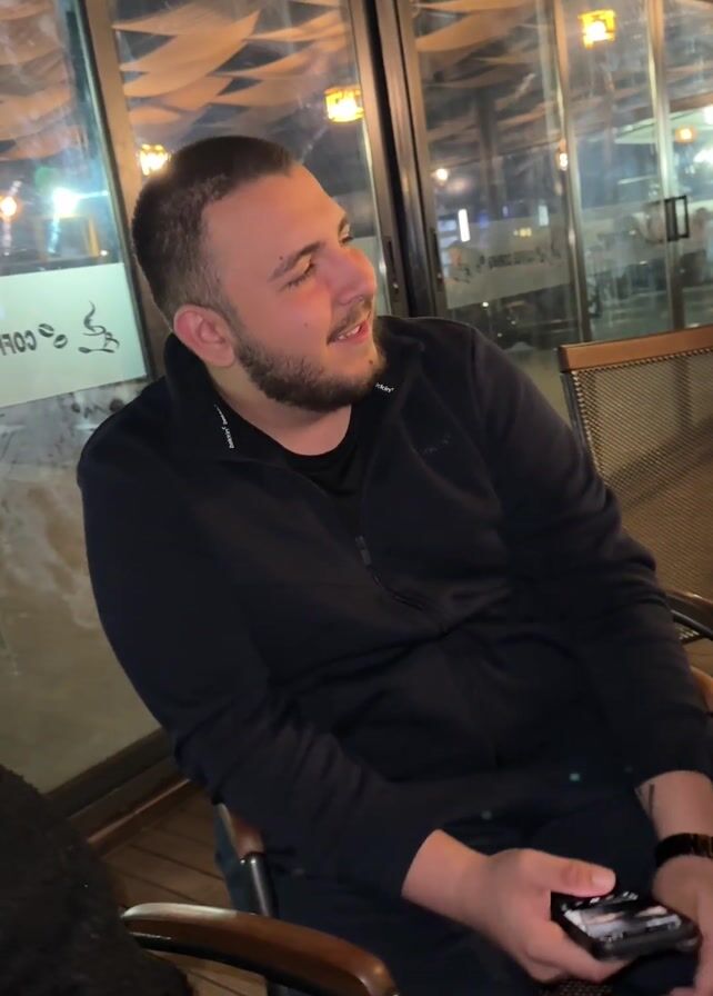 A man sits in a chair, holding a phone. He is wearing a black jacket and pants, and has a beard. He looks up and smiles, then puts a finger to his lips in a shushing gesture before pointing off to the side. The man then looks away, still smiling. A lighter and a pack of cigarettes sit on a table to his right. Behind him is a large glass window with a sign that reads "COFFEE CORNER."