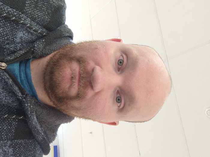 An adult male is depicted in a close-up, head-and-shoulders shot, looking directly at the camera