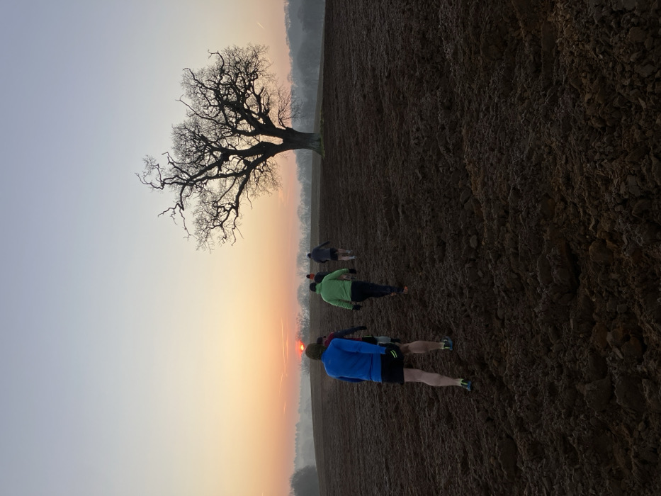 Five individuals are observed from behind, walking uphill across a dark brown, freshly tilled or plowed field under an early morning or late afternoon sky in East Suffolk, United Kingdom. The sky transitions from an orange-red glow on the horizon, where the sun is partially visible, to a pale blue overhead. The foreground and midground consist of rough, clumpy earth. The first individual on the left wears a blue long-sleeved top, black shorts over black leggings, and blue and yellow athletic shoes. The second, partially obscured, wears a dark top and black bottoms. The third, centrally located, wears a bright green long-sleeved top, dark bottoms, and shoes with orange soles. The fourth wears a dark grey top and black shorts. The fifth, furthest back, also wears a dark top and shorts. All five subjects are in motion, ascending the field in the same general direction towards the horizon. To the right of the frame, a large, bare deciduous tree with intricate, dark branches stands silhouetted against the bright sky. In the far distance, a hazy treeline extends across the horizon, beneath the rising or setting sun.