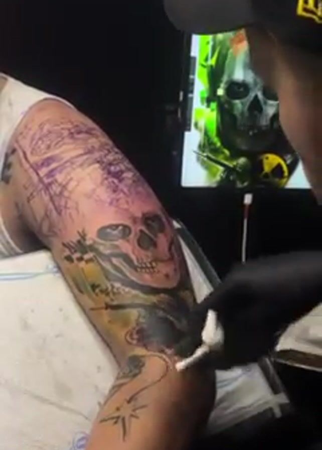 tattoo artist, wearing a black hat, black gloves and multiple bracelets on the left wrist, giving a tattoo on a client’s arm. The tattoo is of a skull and the artist periodically wipes the arm with a white cloth. On a tablet behind the client’s arm, we see an image of the reference skull design. The music playing is pop.