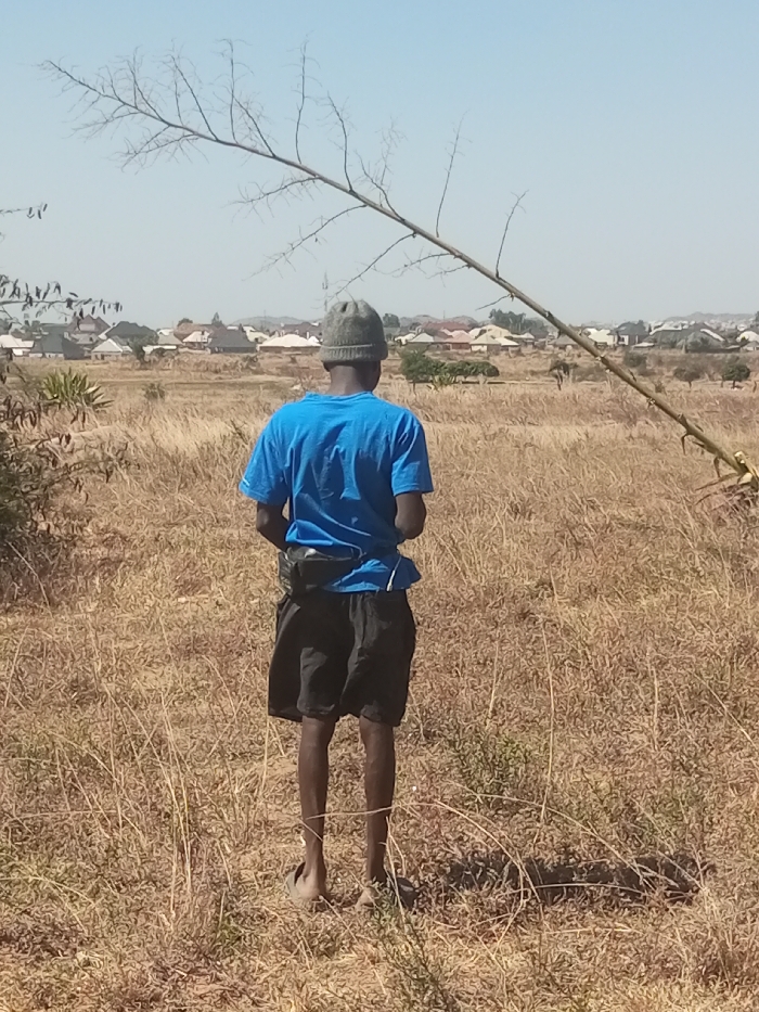 A male figure stands facing away from the viewer in a dry, open field in Bar Gada, Nigeria