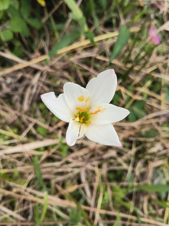A single white six-petaled flower, viewed from directly above, is the primary subject of this close-up photograph taken in Makilala, Philippines. The flower's center features prominent orange-yellow stamens surrounding a green pistil. The petals are white with subtle pinkish hues at their tips; one petal on the upper left exhibits a small, irregular tear or indentation. The background is out of focus, comprised of a mixture of dry, light brown grass blades and indistinct green foliage. A blurred pink object is faintly visible in the upper right quadrant of the background. No human subjects, animals, actions, or direct interactions are present in the scene.