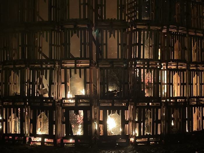 A large, multi-tiered structure made of wooden pallets is on fire