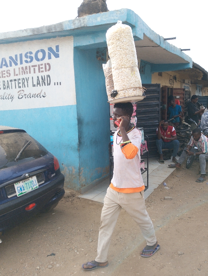 A man walks along a dirt road with a large load of bagged popcorn on his head while talking on a cell phone. He wears a white t-shirt with orange trim, tan pants, and sandals. A dark blue car is parked to his left. Behind him, several people are seated and standing in front of a store with open metal shutters. A sign on the building reads "ANISON BATTERIES LIMITED."