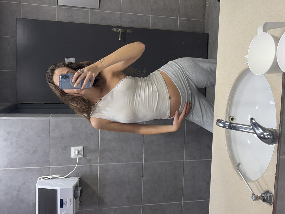 The image displays a female subject taking a mirror selfie inside what appears to be a public restroom in Ramat Gan, Israel. The subject, a female with long brown hair, is wearing a light-colored, one-shoulder crop top and light grey sweatpants. She holds a light blue smartphone in her right hand, pointed towards her reflection to capture the image. Her left hand rests on her lower abdomen. A ring is visible on her right ring finger, a beaded necklace around her neck, and two small vertical line tattoos are present on her left forearm. The background features dark grey tiled walls. To the left, a white "Electromatic Sensore" hand dryer, with Hebrew text indicating "Made in Israel," is mounted above a white electrical outlet. A dark grey door with a silver handle is visible to the right. The foreground shows a light-colored countertop with an oval white sink and a chrome faucet. To the left of the sink, a chrome-plated ritual hand washing dispenser is installed, and two white plastic cups are positioned to the right of the sink.