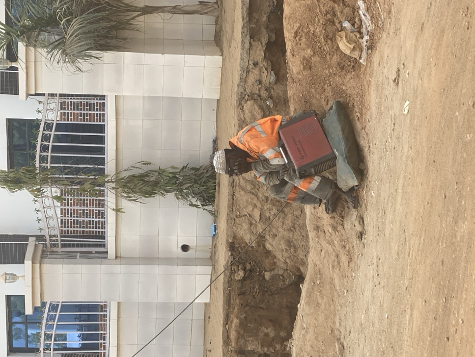 The scene depicts a male individual seated on a dirt mound beside an excavated trench in Fagge D2, Nigeria. The man wears glasses, a white patterned kufi cap, an orange high-visibility long-sleeved shirt with reflective stripes, and grey work trousers, with dark flip-flops on his feet. His left hand is raised to his face. A red and black "Top Flex" inverter welder is positioned on a dark green bag next to him. A thin dark cable extends from the left foreground towards the area where the man is seated. The foreground and middle ground consist of reddish-brown unpaved earth, with significant soil disruption indicating excavation, forming a large trench or ditch. In the background, a light-colored tiled building wall is visible, topped with a white decorative metal fence. Dark windows are apparent behind the fence. Two light-colored wall-mounted luminaires are present on pillars along the wall. A tall, slender tree with green leaves grows directly in front of the wall, and a smaller palm tree is visible to the far right. Scattered debris, including blue plastic and crumpled paper, is present on the ground.