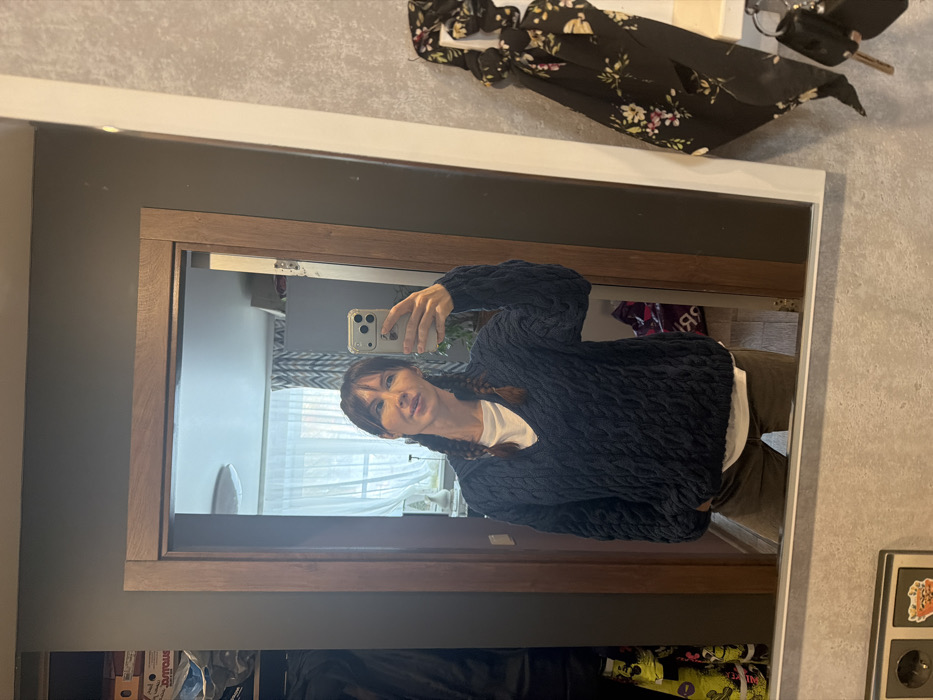 The image depicts an indoor scene within a residential location in Perm, Russia. An adult female, appearing in her 30s-40s, is reflected from approximately the waist up in a large rectangular mirror. She has long dark hair styled in two braided pigtails with visible bangs. She wears a dark blue, chunky cable-knit V-neck sweater layered over a white t-shirt and dark-colored trousers. She is holding a light-colored smartphone with a triple camera array in her right hand, using it to capture a mirror selfie. Her left hand is partially obscured, possibly in a pocket. Her expression is neutral to mildly smiling, with her head tilted slightly to her right. The mirror features a thin white frame along its right edge. To the immediate left of the mirror, a dark grey wall is visible, next to an open storage unit or closet containing stacked boxes and a yellow bag. To the right of the mirror, the wall exhibits light grey textured wallpaper. A narrow shelf below the mirror holds a black scarf with a floral pattern, a keyring with keys, and a framed item displaying a stylized cat-like figure. The reflection within the mirror shows a doorway with a dark brown wooden frame behind the female, leading into another room. This background room is illuminated by natural light from a window, which is covered by white sheer curtains or blinds. A patterned curtain with a dark and light geometric or abstract design is visible to the right of the window. A circular ceiling light fixture is reflected in the upper portion of the mirror. A purple "OZON" shopping bag rests on the floor to the female's reflected right, and a green plant is partially visible behind her right arm. The reflected floor appears to be a light-colored tile or laminate.