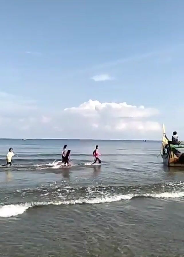 The video depicts a group of people walking through shallow ocean water toward a beached boat on a sunny day