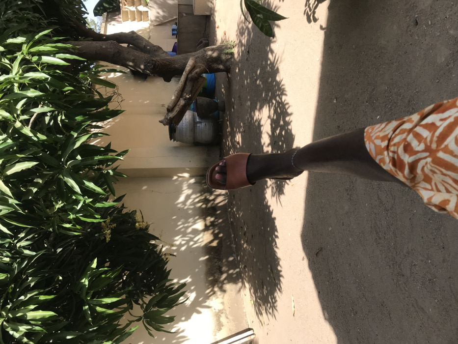 This image, taken in Jimeta, Nigeria, presents a ground-level, first-person perspective. The lower half of a dark-skinned individual's right leg extends from the bottom-left into the center of the frame, clad in a brown open-toed sandal and adorned with a silver anklet. The visible portion of the thigh is covered by fabric featuring an orange and white organic pattern. The ground consists of dry, light brown soil, dappled with numerous distinct shadows cast by overhead tree foliage, indicating strong sunlight. In the background, a light-colored wall with some staining at its base provides a backdrop. A large tree with dense green leaves and a multi-trunked base stands prominent, exhibiting small yellow blooms or fruit among its foliage. Against the wall and near the tree, various objects are present: two stacked cylindrical metal barrels, a dark, squat pot, and a partially visible blue container. Several wooden branches lean against the tree trunk. To the far right, a structure with steps leading upwards is partially visible. The scene is illuminated by direct sunlight, creating sharp contrasts and shadows.