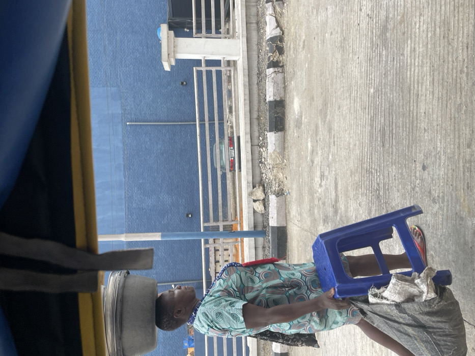 An adult female is depicted in profile, walking rightward on a paved surface in Yenegoa, Nigeria. She has dark skin and short, dark hair. On her head, she balances a grey metal basin. She wears a patterned, knee-length dress primarily in teal and brown, and a blue beaded necklace. In her left hand, she carries a blue plastic stool and a large, grey sack. She wears multi-colored open-toed sandals. The walking surface is concrete with horizontal grooves. To her right, a black and white painted curb, exhibiting some damage, separates the road from a raised, unpaved area of dirt and small rocks. In the mid-ground, a horizontal metal fence runs across the scene. Behind the fence, the rear portion of a dark-colored sedan is partially visible. Further back, a tall, white concrete pillar with a square capital stands. The background is dominated by a large building with a royal blue, textured facade, possibly brick or block, on which two wall-mounted lights are visible. A thin, grey vertical pole stands in front of the building. The top of the image is obscured by an overhead structure, likely from a vehicle, featuring blue, yellow, and black sections with two grey straps hanging down.