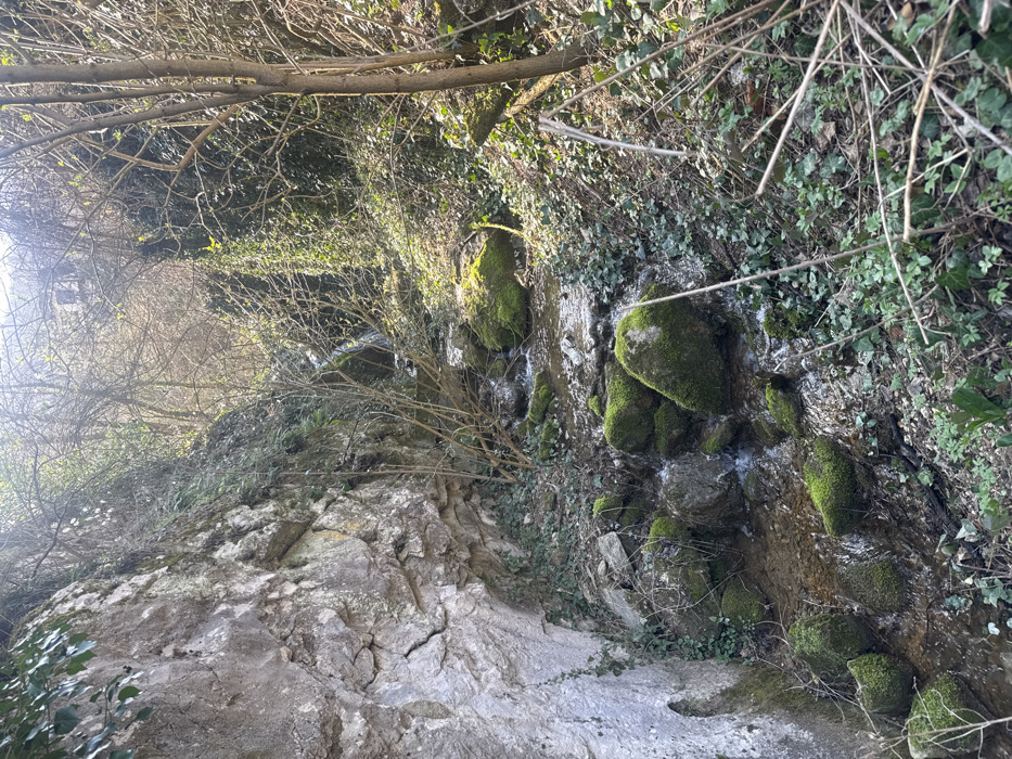 The scene depicts a narrow, rocky watercourse located within a vegetated gorge in Lyutibrod, Bulgaria. A shallow stream flows from the background towards the foreground, traversing a bed composed of numerous irregular rocks, many of which are significantly covered in bright green moss. The water exhibits minor turbulence as it flows over and around these moss-laden stones. To the left, a large, light-grey rock face forms a steep wall, displaying prominent fissures and patches of darker growth. The right side of the gully features a sloped bank densely covered with various green foliage, including ivy-like plants, and numerous bare deciduous tree branches. Additional bare branches are visible throughout the upper sections of the gully, suggesting a late winter or early spring season. Direct sunlight illuminates the scene from an elevated position, casting bright reflections on the water and creating dappled light conditions. In the distant upper-center, a small waterfall or cascade is visible where the stream descends further into the gully. Beyond the vegetation in the upper background, a light-colored structure, possibly a building, is partially discernible, indicating the proximity of human settlement to this natural area. No individuals or animals are present.