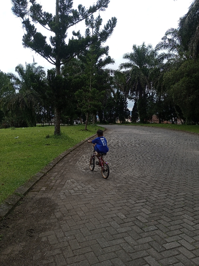 A young child wearing a blue t-shirt with the number 17 on the back rides a red bicycle on a paved brick path. The path winds through a park-like setting with tall trees and green grass on the left side. The trees include palm trees and tall coniferous trees. The sky is overcast, suggesting a cloudy day. The child is the main focus, moving away from the viewer on the pathway.