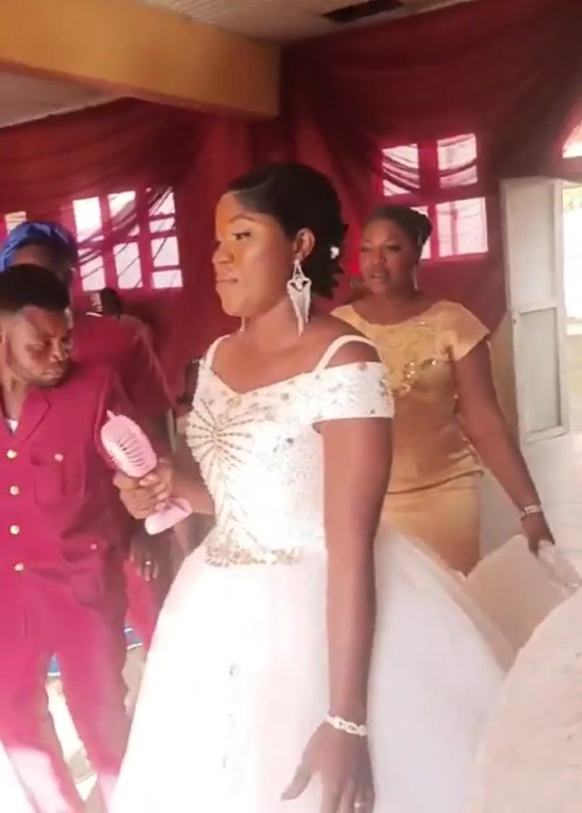 bride at her wedding. She's wearing a white, off-the-shoulder gown, sparkly earrings, and a bracelet. She's holding a small pink fan. Several people are around her, including a man in a maroon suit, a woman in a gold dress, and other guests dressed in formal attire. They appear to be indoors, possibly in a reception area, which is decorated with red drapes. The bride seems to be moving forward with a slight smile. Music is playing in the background.