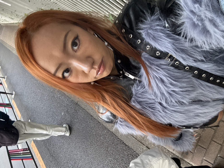 A tilted selfie shows a woman with auburn hair wearing a black leather jacket with a grey faux fur collar. The jacket features silver studs and a buckle detail. She wears large, teardrop-shaped earrings. Part of another person in beige pants and white shoes is visible in the bottom left corner. The background includes grey pavement and a metal railing with multi-colored posts.