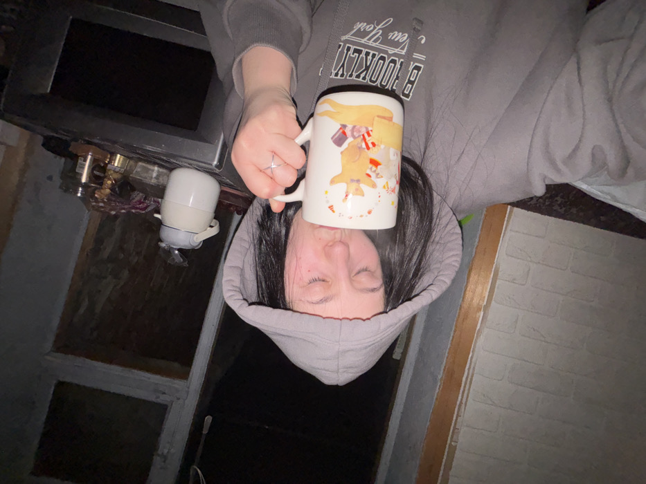 A person in a gray hooded sweatshirt holds a white mug with cartoon graphics above their forehead. The person's eyes are closed. The background includes a dark, windowed area with a water dispenser and an appliance with knobs. Part of a gray "Brooklyn" sweatshirt is visible. A white brick wall is also visible. The photo is rotated, placing the person upside down in the frame.