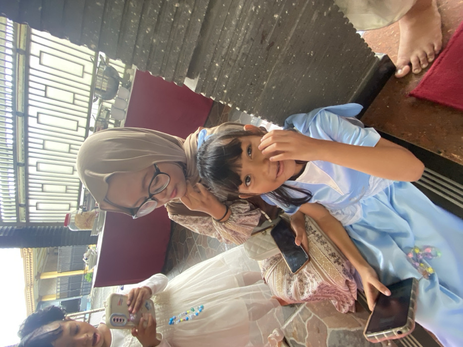 Three people pose together. A woman in a hijab and glasses looks down at a young girl in a blue dress. The girl smiles while holding a phone. A third person in a white dress also holds a phone. The group sits on a tiled surface, with a metal structure in the background and a red object in the distance.