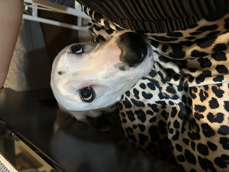 A white dog with black spots gazes upward, its head tilted, with wide, dark eyes. The dog's nose is black, with pinkish hues near the upper part. Part of the dog's body is obscured by a leopard print fabric, and what looks like striped material is partially visible above it. The dog rests on a reflective black surface, likely a table, with a light-colored object visible in the background.