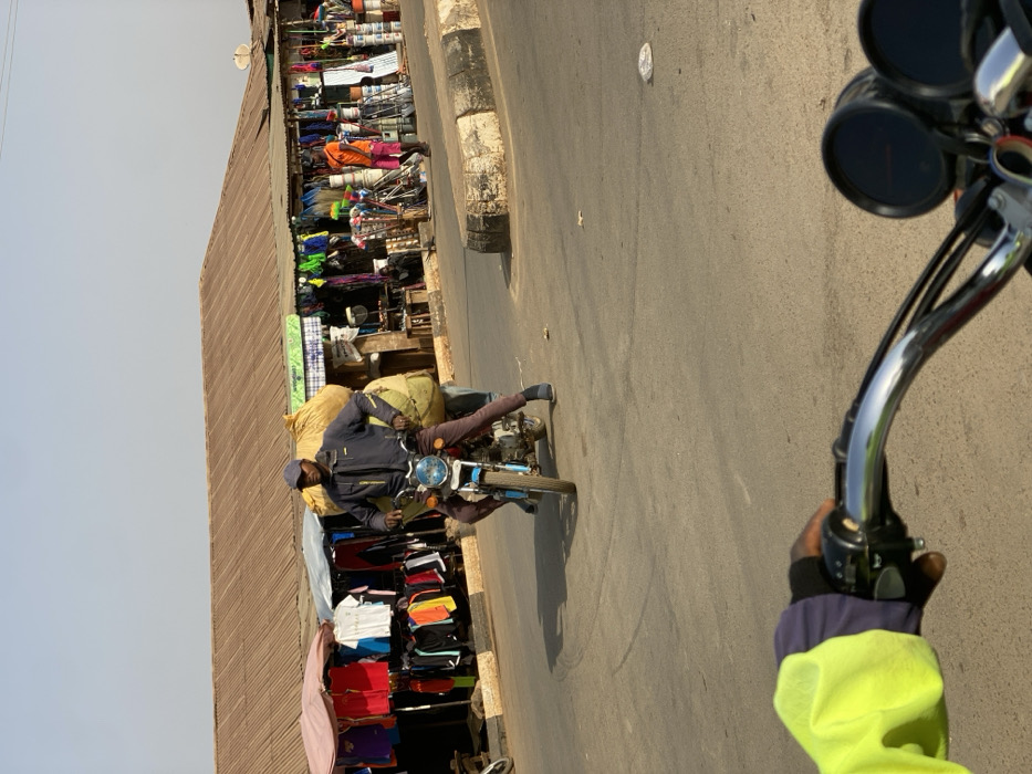 The image captures a sunny daytime street scene in Kafanchan B, Nigeria, from the perspective of a motorcycle rider