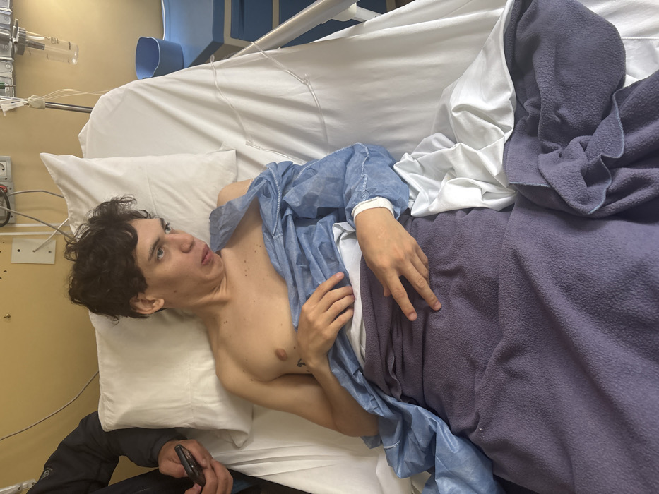- "A thin, curly-haired person lies in a hospital bed, partly covered by a purple blanket and a blue medical gown" by FM-uVwPE3, licensed under CC BY 4.0