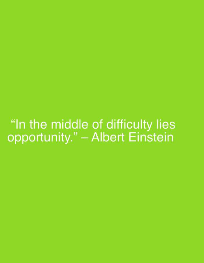 A vibrant green background displays a quote in a matching, slightly lighter green. The quote reads: “In the middle of difficulty lies opportunity.” - Albert Einstein. The text is centered and occupies the lower portion of the image, leaving the upper part of the background unadorned. The quote promotes a positive outlook on challenges.