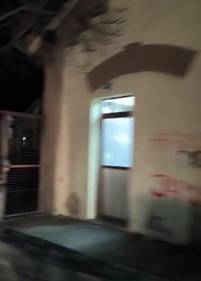 The video appears to be taken at night from a moving vehicle, showing a series of buildings and structures along a dark street