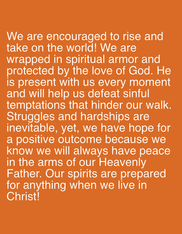 The image displays a message of Christian encouragement. It states that believers are encouraged to face the world, protected by spiritual armor and God's love. God is ever-present, helping to overcome sinful temptations. Hardships are inevitable, yet hope remains, as peace is found in God's embrace. The text concludes with the assurance that spirits are prepared for anything when living in Christ.