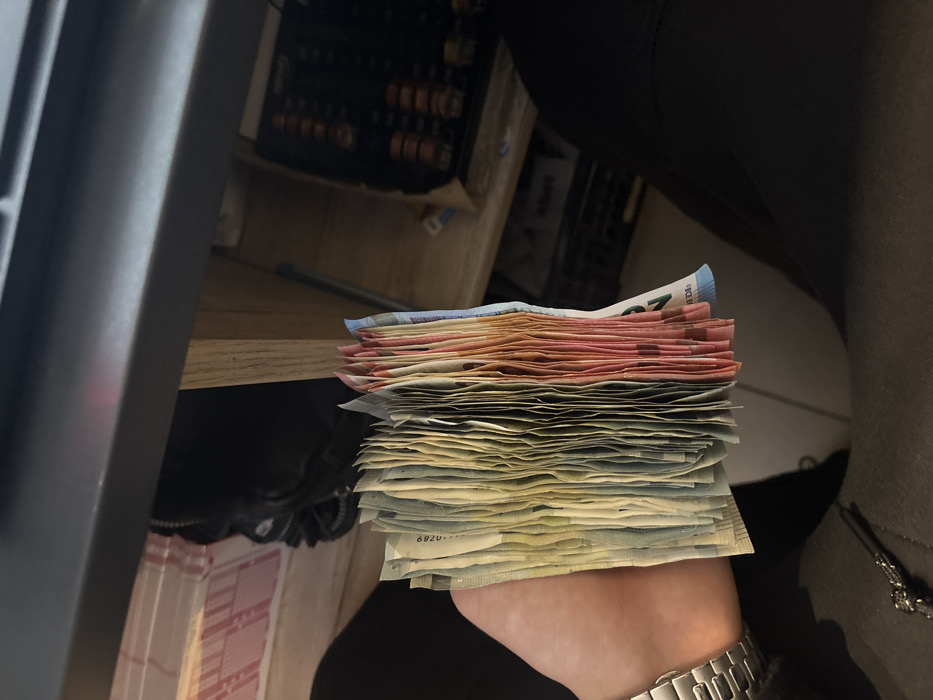 - "A close-up, first-person perspective photograph captured indoors depicts a left hand holding a thick, fanned stack of Euro banknotes, displaying a spectrum of denominations characterized by their green, light yellow, blue, and red/orange hues" by FM-AMpuW2, licensed under CC BY 4.0