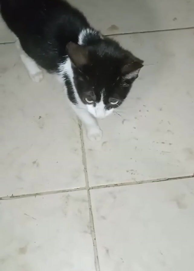 A high-angle shot shows a black and white cat standing on a tiled floor