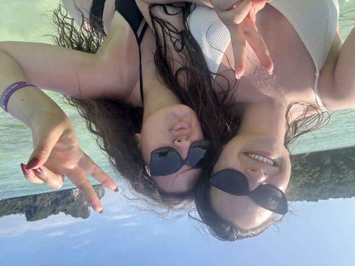 Location: Unknown city, Unknown country. The background features prominent limestone karsts covered in dense green foliage rising from clear turquoise water, characteristic of a tropical island environment such as those found in Southeast Asia. Two young adult females are depicted in a close-up selfie-style photograph, partially submerged in clear, light-turquoise water under a bright, cloudless blue sky. The female on the left has dark, wet hair and is wearing black cat-eye sunglasses and a white textured bikini top. She is smiling, showing her teeth, and has her left hand near the bottom of the frame, forming a peace sign. The female on the right has long, dark, curly, wet hair and is wearing black oversized sunglasses and a black bikini top. She is pouting her lips and has her right hand raised, forming a peace sign. A purple wristband with white text, partially legible as "088-873-xxxx" in what appears to be Thai script, is visible on her left wrist. Her left shoulder displays areas of erythema consistent with sunburn. Both individuals appear to be posing for the camera, suggesting a leisurely or recreational activity in a marine setting.