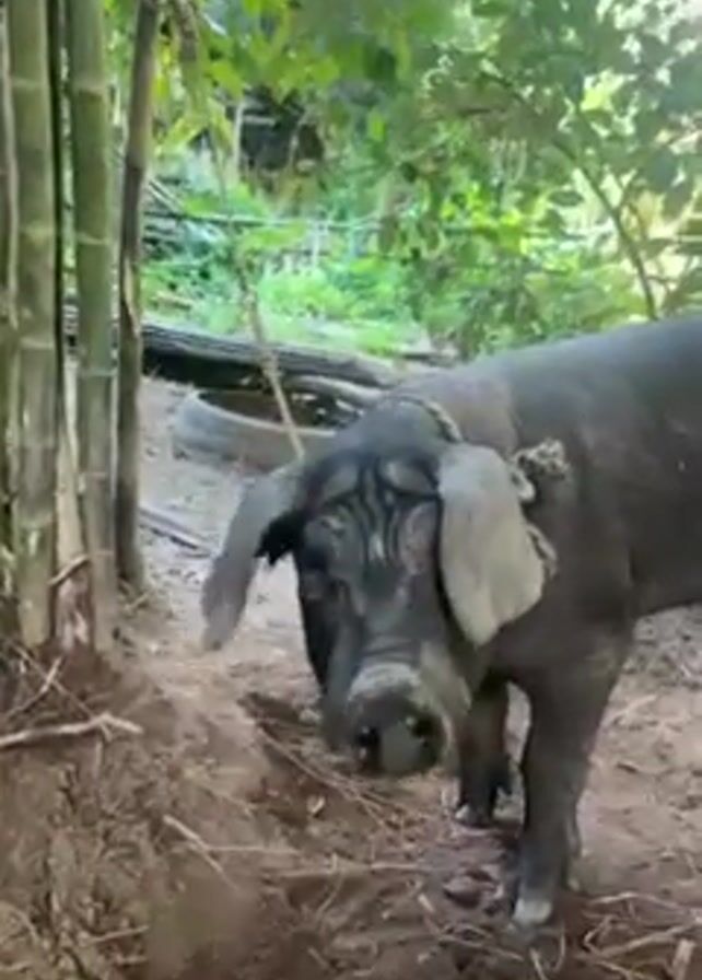 black pig standing in a muddy area under trees. The pig is tied to a tree with a rope around its neck. The ground around the pig is disturbed, appearing to have been dug up. The pig is snorting and moving its head around. The environment is a somewhat overgrown, wooded area.