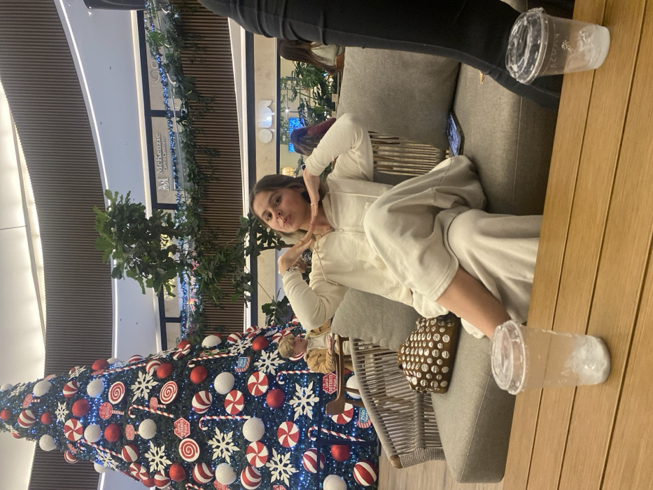 A young woman in a white jumpsuit poses with her hands framing her face, seated on a grey sofa. Beside her is a decorative pillow. An elaborate Christmas tree with red and white ornaments stands nearby. A coffee table with two drinks is in front of the sofa. In the background, part of a multi-story building is visible, featuring garlands and a store sign. A person in black pants is seated to the right, with only their legs and part of their torso visible.