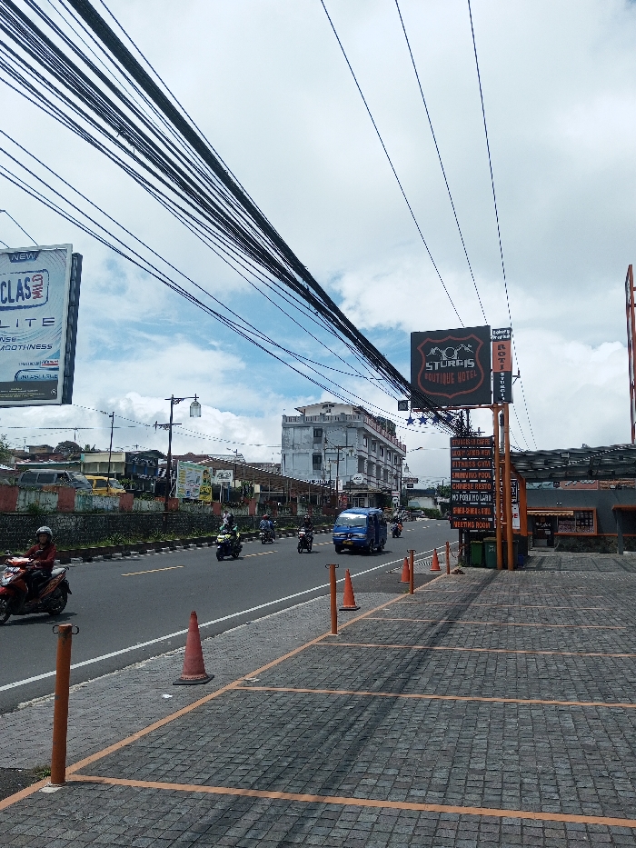 A street view with overhead cables dominates the frame. Several vehicles, including motorcycles and a blue van, travel on the road. Orange traffic cones and poles line the side of the road, bordering a paved parking area marked with yellow lines. Signs for "STORGIS BOUTIQUE HOTEL" and "CLAS ELITE" are visible. A multi-story building stands in the background under a cloudy sky.