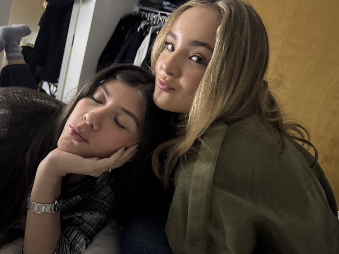 Two young women pose closely together. One woman with long, dark hair rests her head on her hand, eyes closed, wearing a plaid shirt and a silver watch. The other woman, with shoulder-length blonde hair, puckers her lips toward the camera, wearing an olive green jacket. A partially visible person with gray socks and dark pants lies in the background, along with a closet filled with hanging clothes. The background includes a white wall, a door, and a gold-colored wall.