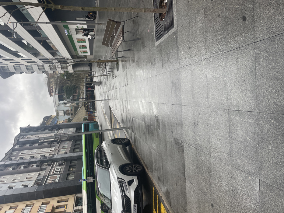 The scene depicts an urban street in Eibar, Spain, under an overcast sky, with surfaces appearing wet from recent precipitation. The perspective is from a sidewalk looking down a street that curves slightly to the right. In the foreground, a grey tiled sidewalk, wet and reflective, extends from the bottom of the frame. To the left, a white Renault Austral SUV with license plate "S NCH" is parked parallel to a yellow-painted curb line. Beyond the SUV, the asphalt road is also wet. A green and blue city bus is visible on the road, partially obscured by the SUV and a street pole, moving from left to right. Along the right side of the sidewalk, two empty park benches with wooden slats and dark metal frames are positioned. Several young, leafless trees with dark metal grates around their bases are interspersed along the sidewalk. A dark grey public waste receptacle stands in the mid-ground. Buildings line both sides of the street. On the left, multi-story residential buildings with dark grey and lighter-toned facades, featuring balconies and numerous windows, rise steeply. On the right, a modern, multi-story building with a light-colored facade and rounded architectural elements occupies the street front. Its ground floor houses a commercial establishment with green-framed display windows and posters. Several indistinct figures are visible near the entrance of this establishment. In the mid-distance on the opposite side of the road, a dark-framed bus stop shelter with a transparent roof is present. Beyond the immediate street level, a steep, tree-covered hillside with additional buildings, some with colorful facades (e.g., light blue, beige), ascends into the background. The overall lighting is diffused, consistent with an overcast day.