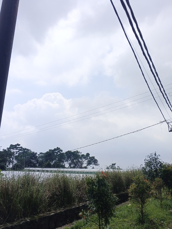 The image depicts an outdoor agricultural landscape under an overcast sky in Uato Carabar, Timor-Leste. The upper portion of the frame is dominated by a light grey sky featuring large, soft white cumulus clouds. A dark utility pole runs vertically along the left edge, partially out of frame. From the upper right, multiple dark utility lines extend diagonally downwards, with additional thinner, dotted lines traversing horizontally across the mid-ground. The lower half of the image showcases varied vegetation. A narrow, dark ditch or channel is visible in the lower foreground, separating two distinct areas of greenery. To the right of this channel, several small, bushy plants with green foliage and occasional reddish-orange highlights are present. To the left, a dense field of tall green grasses or reeds extends into the mid-ground. Beyond these grasses, a large expanse of what appears to be agricultural land is covered by numerous white sheets or structures, consistent with greenhouses or crop covers. In the background, a dense treeline of dark green trees with rounded canopies forms the horizon. No people, discernible actions, or interactions are visible.
